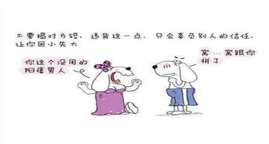 4、避免人身攻擊。夫妻吵架,當(dāng)問題吵不清時(shí),就將吵架轉(zhuǎn)為人身攻擊,如:你不是個(gè)好人等,把吵架變成謾罵。這是最容易傷害彼此感情的。