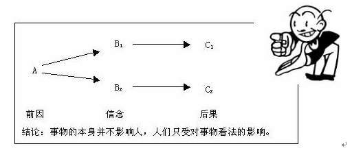 如圖中,A(Antecedent)指事情的前因,C(Consequence)指事情的后果,有前因必有后果,但是有同樣的前因A,產(chǎn)生了不一樣的后果C1和C2。這是因?yàn)閺那耙虻浇Y(jié)果之間,一定會(huì)透過一座橋梁B(Belief),這座橋梁就是信念和我們對(duì)情境的評(píng)價(jià)與解釋。又因?yàn)?,同一情境之下?/span>A),不同的人的理念以及評(píng)價(jià)與解釋不同(B1和B2),所以會(huì)得到不同結(jié)果(C1和C2)。因此,事情發(fā)生的一切根源緣于我們的信念、評(píng)價(jià)與解釋。
