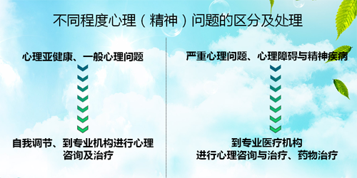 6.當人處于心理亞健康、心理疾病或精神疾病時,不同程度的心理問題和精神疾病處理和治療方法的側重點會有所不同,心理問題和精神疾病的嚴重程度有輕、中、重等不同等級之分,但這些等級又不是一層不變的,因心理問題和精神疾病是一個發(fā)展變化的過程,嚴重程度也會隨著各種因素的變化而變化,需要用動態(tài)、發(fā)展的眼光來看待、處理和治療。