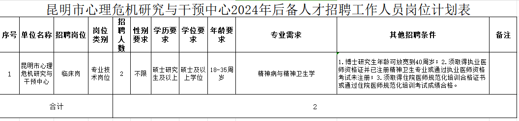附件1昆明市心理危機(jī)研究與干預(yù)中心2024年后備人才招聘崗位計(jì)劃表