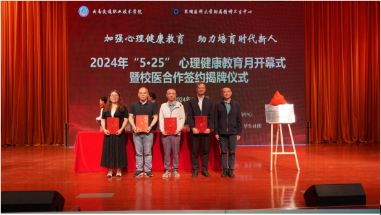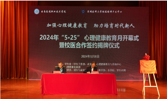 2024年5月8日,在云南交通職業(yè)技術(shù)學(xué)院呈貢校區(qū),順利舉行了昆明醫(yī)科大學(xué)附屬精神衛(wèi)生中心(云南省精神病醫(yī)院)與云南交通職業(yè)技術(shù)學(xué)院醫(yī)校合作簽約揭牌儀式暨2024年“5.25”心理健康教育月開幕式。參加此次會議的有:昆明醫(yī)科大學(xué)附屬精神衛(wèi)生中心康復(fù)治療中心主任合浩、昆明醫(yī)科大學(xué)附屬精神衛(wèi)生中心康復(fù)科二區(qū)主任張勇輝、昆明醫(yī)科大學(xué)附屬精神衛(wèi)生中心女性精神科主任王海明、昆明市心理危機研究與干預(yù)中心助理研究員楊婷、云南大學(xué)心理健康中心解亞寧教授、云南師范大學(xué)李輝教授、云南交通職業(yè)技術(shù)學(xué)院副校長周舟、云南交通職業(yè)技術(shù)學(xué)院學(xué)生處副處長鄧瑾、云南云南交通職業(yè)技術(shù)學(xué)院全體心理老師級輔導(dǎo)員老師及部分學(xué)生代表。
