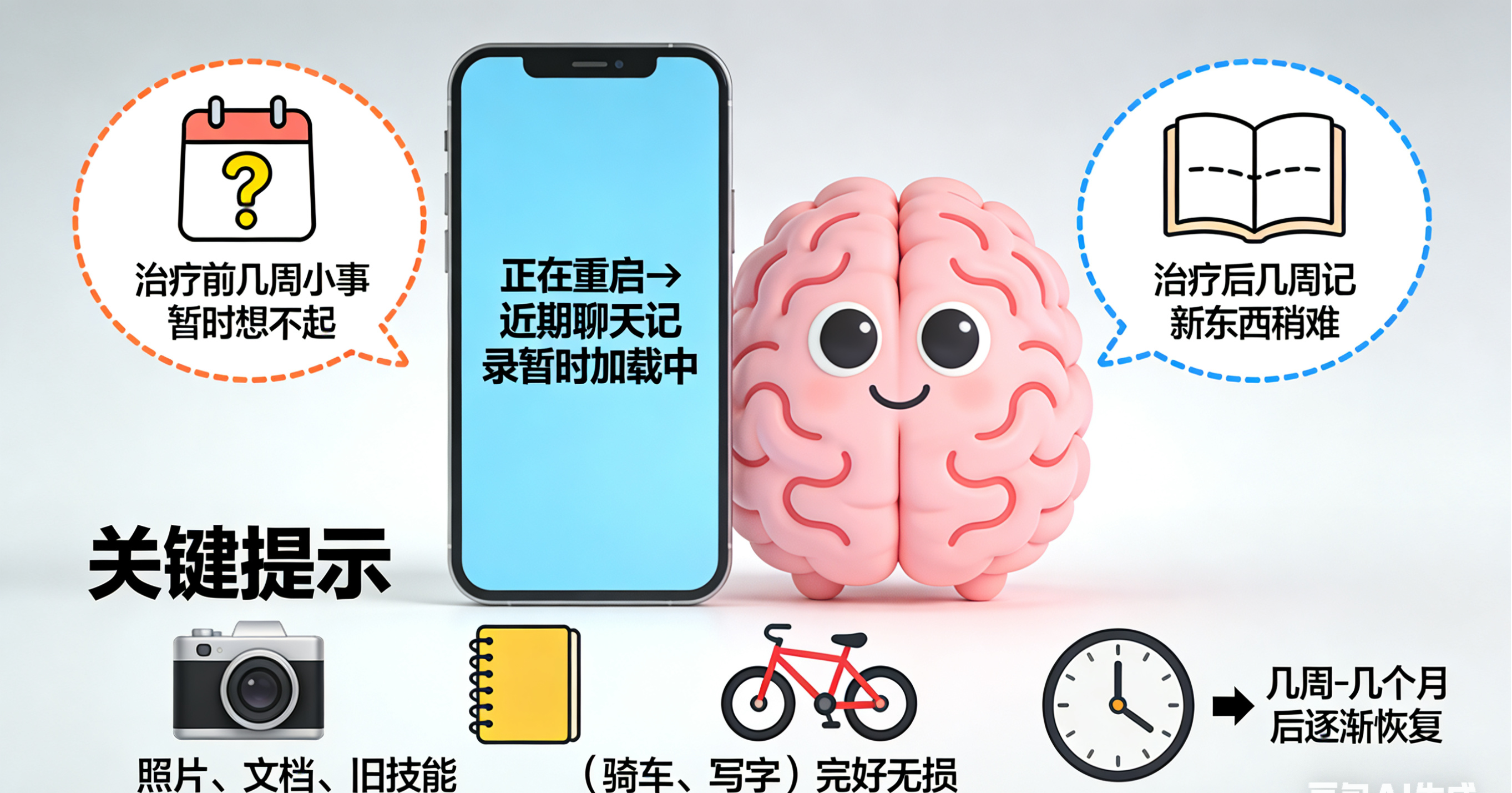 關(guān)鍵點(diǎn)在于: 這些記憶影響絕大多數(shù)是暫時(shí)的、可逆的。就像手機(jī)重啟后,正在運(yùn)行的某些應(yīng)用數(shù)據(jù)可能暫時(shí)丟失,但系統(tǒng)本身和存儲的照片、文檔都完好無損。記憶通常會在治療結(jié)束后幾周至幾個(gè)月內(nèi)逐漸恢復(fù)。