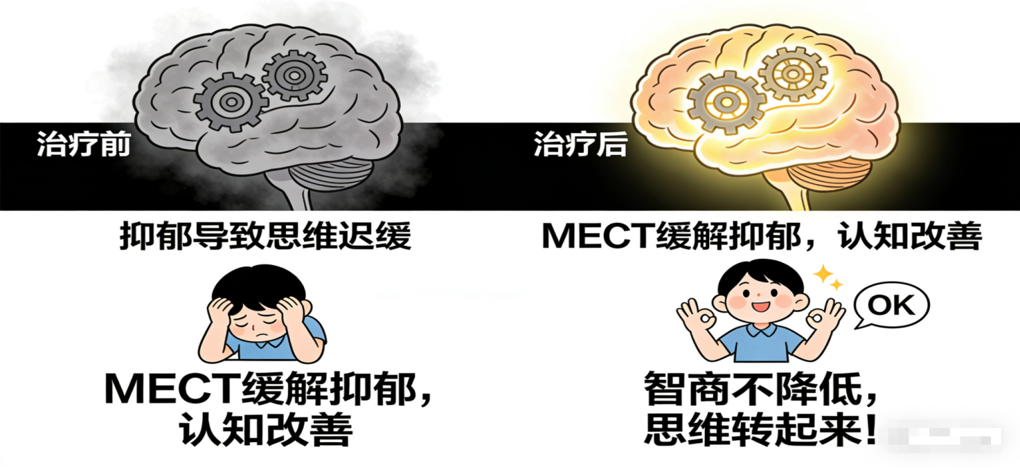 不會。 大量長期隨訪研究證實(shí),MECT不會降低智商,也不會損害長期的認(rèn)知功能(如邏輯思維、判斷力、學(xué)習(xí)能力)。相反,當(dāng)嚴(yán)重的抑郁癥狀(如思維遲緩、無法思考、注意力渙散)得到緩解后,患者的認(rèn)知功能往往會顯著改善,感覺“腦子重新轉(zhuǎn)起來了”。