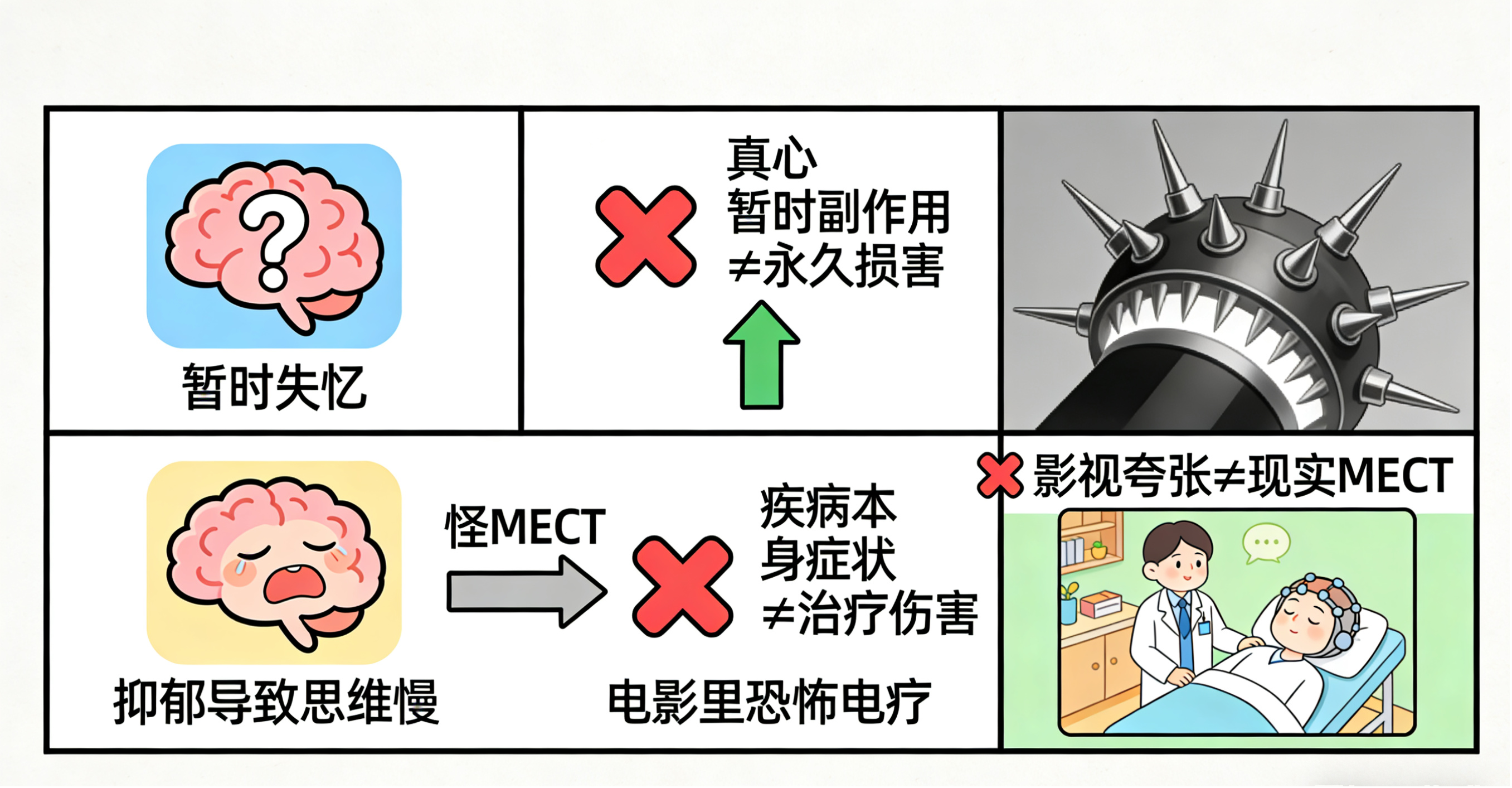 將疾病本身的癥狀歸咎于治療。例如,重度抑郁癥本身就會導(dǎo)致思維遲緩、記憶力下降(稱為“假性癡呆”)。當(dāng)MECT緩解了抑郁,但記憶恢復(fù)稍慢時(shí),容易被誤解。
