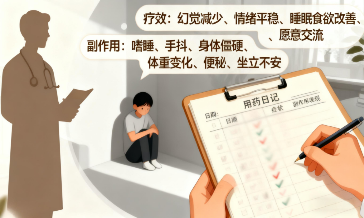 · 療效:他的幻覺是否減少了?情緒是否平穩(wěn)些了?睡眠和食欲有改善嗎?愿意和家人說話了嗎?