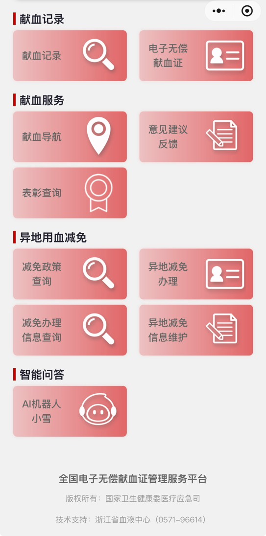 通過關(guān)注微信“全國電子無償獻血證”小程序在線辦理血費跨省異地減免申請。在菜單欄點擊“異地用血減免”→“異地減免辦理”。