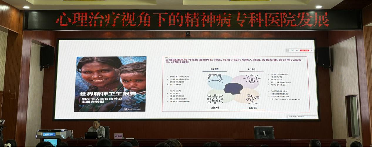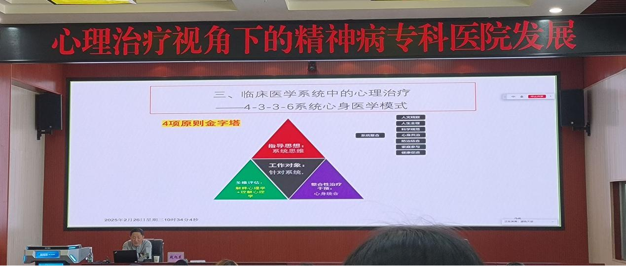 講座上,趙旭東教授回溯中國(guó)心理治療學(xué)科化進(jìn)程,他強(qiáng)調(diào),云南省精神病醫(yī)院作為?發(fā)源地與奠基者?的地位早已鐫刻于歷史坐標(biāo)——?80年代,就率先引入中德聯(lián)合心理治療培訓(xùn)項(xiàng)目(中德班)?,不僅成為該項(xiàng)目的首批臨床示范基地,完整保存了包括6000冊(cè)德文原版專(zhuān)著、手稿及早期治療錄像在內(nèi)的?“學(xué)術(shù)活化石”?,現(xiàn)今更依托精神疾病臨床醫(yī)學(xué)中心的地緣優(yōu)勢(shì),推動(dòng)少數(shù)民族精神疾病樣本庫(kù)的建設(shè),這都為醫(yī)院的發(fā)展奠定了堅(jiān)實(shí)的基礎(chǔ)。趙旭東教授重點(diǎn)介紹了“4-3-3-6系統(tǒng)心身醫(yī)學(xué)模式”,該模式強(qiáng)調(diào)心理治療與藥物治療的有機(jī)結(jié)合,以及個(gè)體、家庭、社會(huì)三個(gè)層面的綜合干預(yù),為精神病專(zhuān)科醫(yī)院的發(fā)展提供了新的思路。最后,趙旭東教授對(duì)國(guó)內(nèi)心理治療領(lǐng)域的未來(lái)發(fā)展進(jìn)行了展望,呼吁加強(qiáng)人才培養(yǎng)、完善法律法規(guī)、提高社會(huì)認(rèn)知,推動(dòng)心理治療在精神衛(wèi)生領(lǐng)域發(fā)揮更大作用。