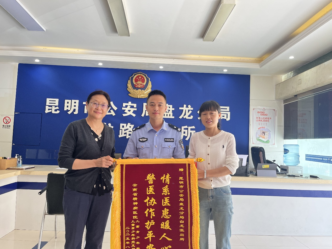 2025年9月2日,兒童青少年科楊麗主任及楊秀和護(hù)士長(zhǎng)代表科室及支部,將一面寫有“情系醫(yī)患暖人心,警醫(yī)協(xié)作護(hù)平安”的錦旗送至昆明市公安局盤龍分局白龍派出所,向派出所長(zhǎng)期以來對(duì)兒童青少年科日常工作的大力支持與無私幫助致以誠(chéng)摯感謝。
