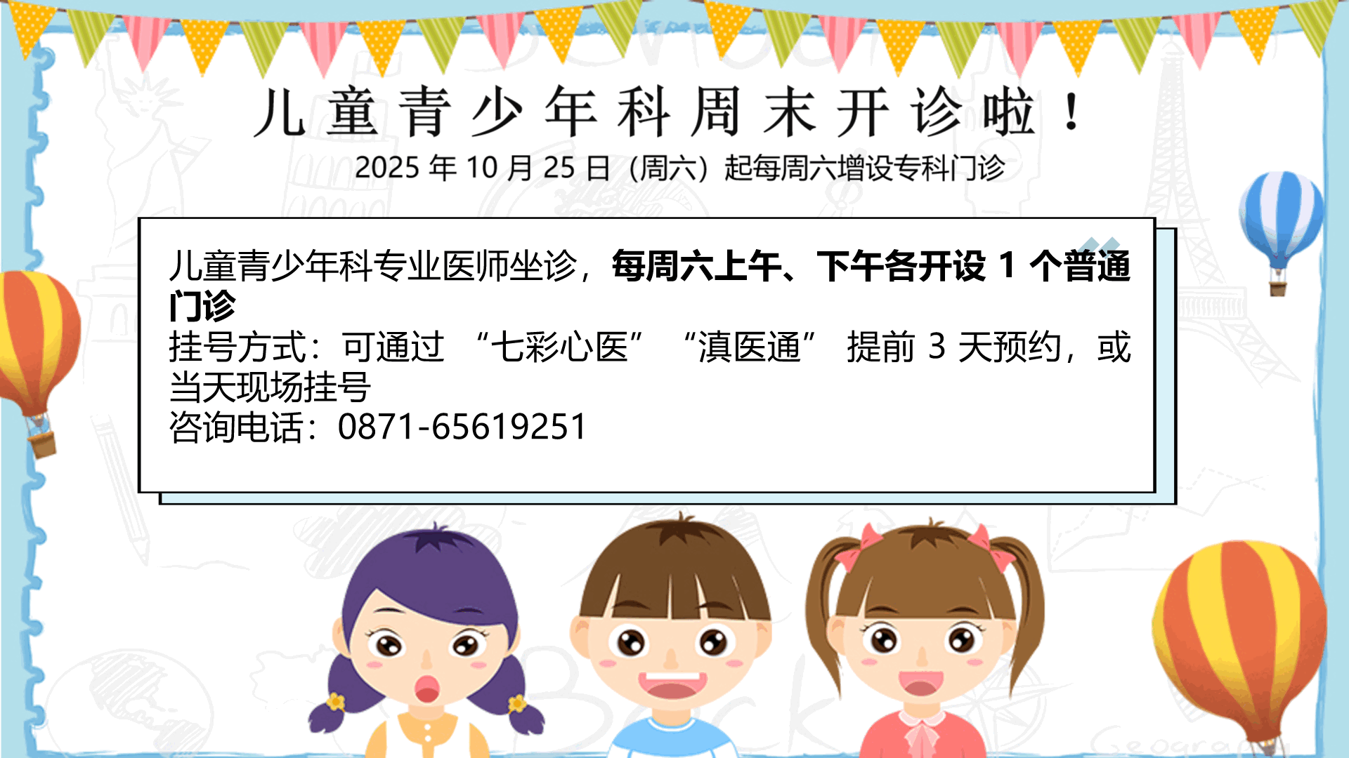 請各位家長根據(jù)孩子的需求,合理選擇就診時間。就診人員可通過七彩心醫(yī)、滇醫(yī)通提前三天預(yù)約掛號或當(dāng)天現(xiàn)場掛號,有疑問可撥打兒童青少年科電話(0871-65619251)咨詢。